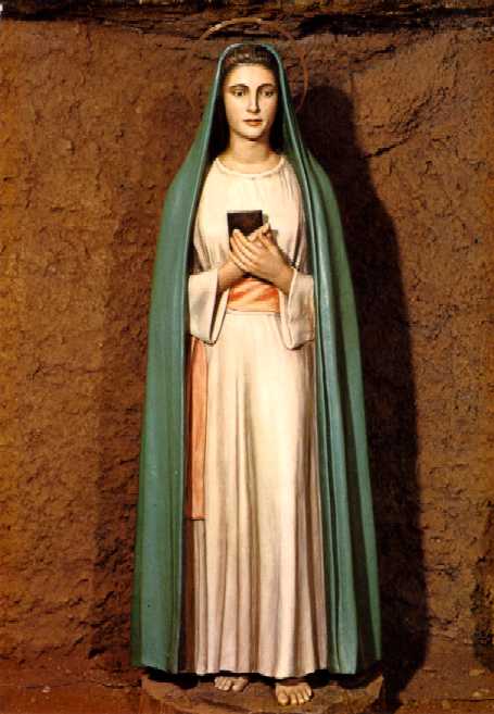Then Bruno himself saw the beautiful lady. She wore a green mantle over a white dress with a rose-coloured sash around her waist. The lady was holding a Bible and called herself “Virgin of the Revelation.” She identified herself as: “Daughter of the Father, the Mother of the Son, and Spouse and Temple of the Holy Spirit.”